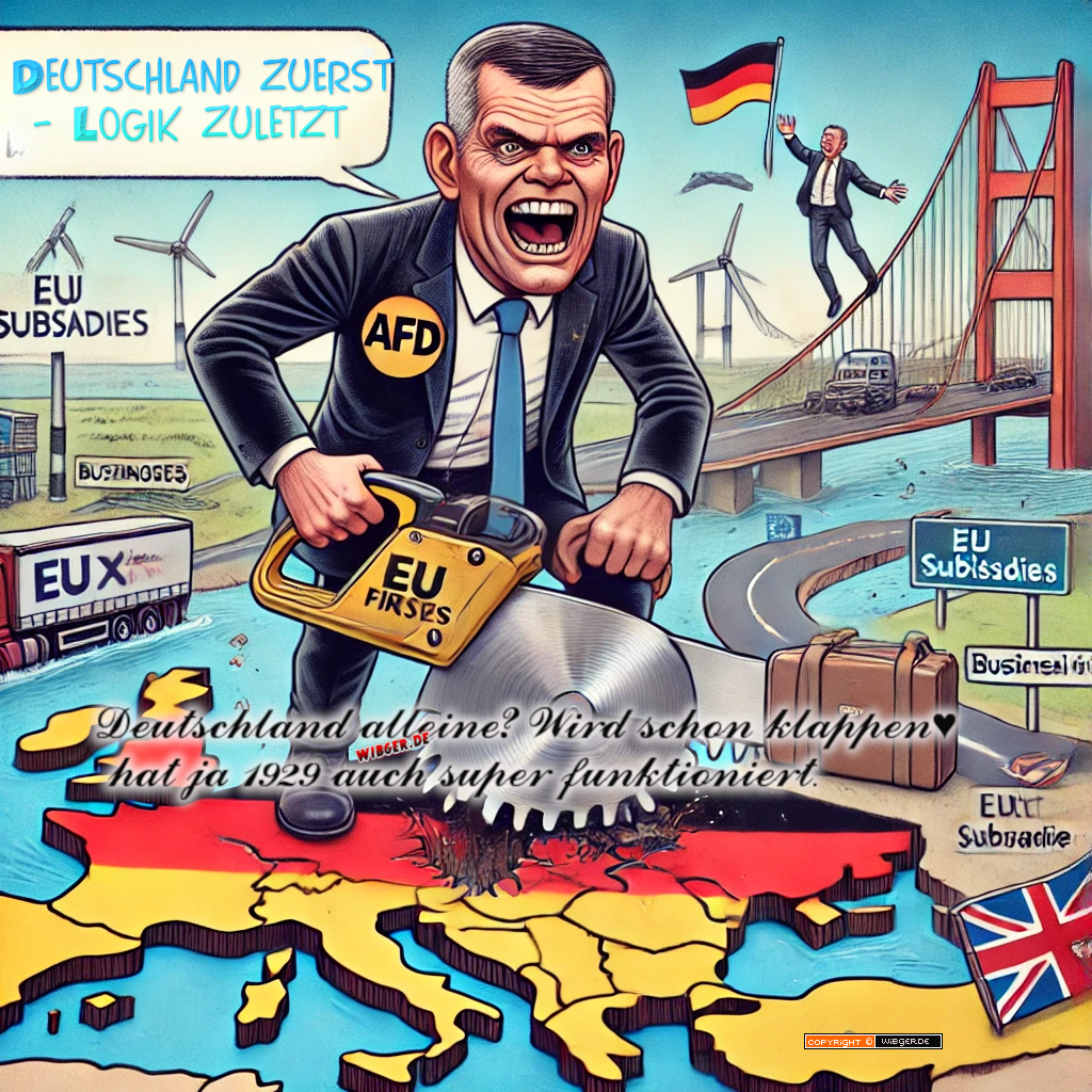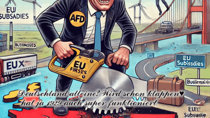 Ach, die AfD mal wieder. Während andere Parteien sich mit so nervigen Dingen wie „Realpolitik“ oder „Wirtschaftsstrategien“ herumschlagen, hat die Alternative für Dumme – äh, Deutschland – mal wieder eine ganz neue Lösung: Einfach das ganze Land aus Europa rausschneiden! Zack, Säge angesetzt, ein bisschen hin und her gewackelt – und schwupps, Deutschland schippert als unabhängige Insel irgendwo auf dem Ozean herum. Perfekter Plan, was soll da schon schiefgehen?
